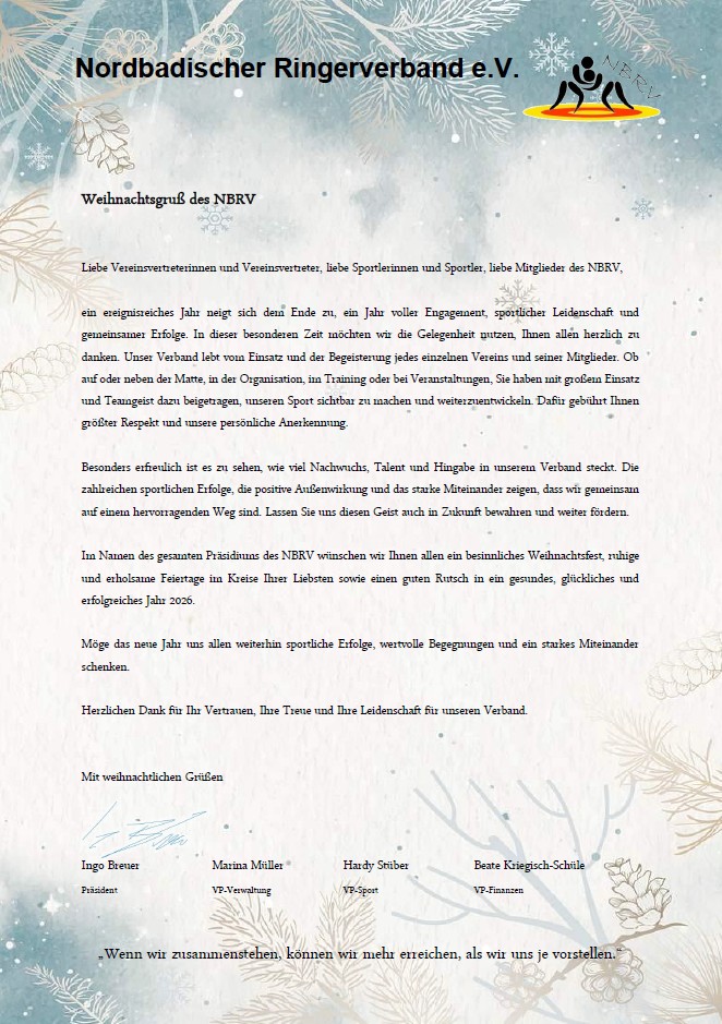 Im Rahmen der im Dezember abgehaltenen Weihnachtsfeier der NBRV Kampfrichter verabschiedeten die Kampfrichter des NBRV ihren geschätzten Kollegen Dieter Singer aus dem aktiven Kreis. Mit großem Dank und Anerkennung würdigten sie seine jahrzehntelange ehrenamtliche Tätigkeit auf den Ringermatten.